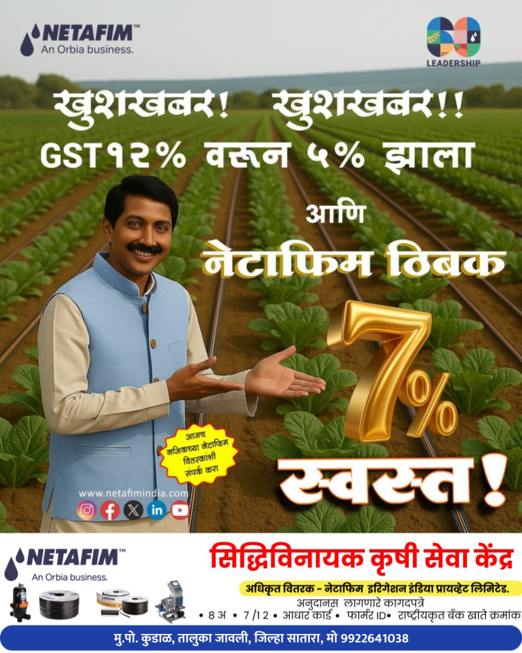 केंद्र शासनाच्या निर्णयानुसार, ठिबक सिंचनावर जीएसटी १२ टक्क्यांवरून केवळ ५ टक्क्यांवर आणण्यात आला आहे. विशेष म्हणजे, नेटाफिम ठिबक अवघ्या ७ टक्के जीएसटीवर आता शेतकऱ्यांना मिळणार आहे.